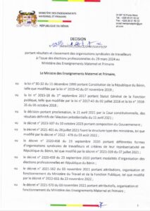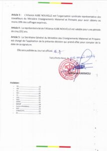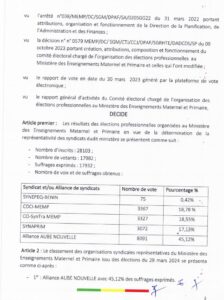 Elections sectorielles dans le secteur éducatif Voici la décision qui reconnaît L’alliance » Aube Nouvelle » comme Organisation syndicale la plus représentative au MEMP