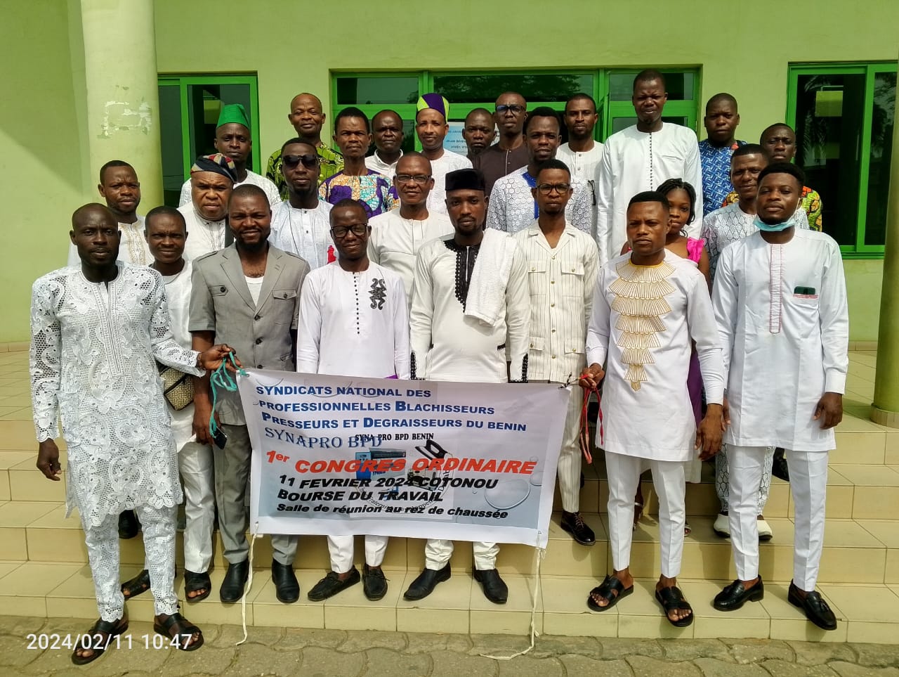 Le Syndicat National des Professionnels Blanchisseurs, Presseurs et Dégraisseurs du Bénin (Synapro Bpd) est désormais porté sur les fonts baptismaux. Cette organisation syndicale, née de la volonté des professionnels exerçant dans ces métiers, entend défendre et contribuer pour le bien-être des professionnels blanchisseurs, presseurs et dégraisseurs. A l’ouverture des travaux, le Président du Comité d’Organisation dudit congrès, Christian Tovodounon, est revenu sur les motivations des membres constituant ce creuset de se mettre en syndicat et le parcours menant à la concrétisation dudit congrès. Au cours du congrès constitutif, les congressistes ont eu à réfléchir sur la vie de leur organisation syndicale. Ils ont également eu à étudier leurs différents documents fondamentaux (Statuts et Règlement intérieur). L’occasion c’était également donnée de prendre, d’importantes décisions pour le bien des travailleurs du secteur d’activités et d’élire le bureau directeur qui conduira désormais les destinés du Syndicat. Ce bureau a, à sa tête, M. Christian Tovodounon. Une fois élu, le désormais secrétaire général Synapro Bpd a remercié les congressistes du choix qu’ils ont porté sur sa personne ainsi que sur les autres membres du bureau directeur. Il a ensuite, pris l’engagement solennel au nom du bureau directeur élu, de ne pas décevoir les attentes des travailleurs réunis au sein du Synapro Bpd.