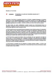 A travers une déclaration signée en date de 27 avril 2024, la Fédération générale du travail de Belgique (FGTB) exprime sa solidarité avec les dirigeants et militants syndicaux arrêtés à la marche du samedi 27 avril 2024 contre la cherté de la vie. Elle condamne l’arrestation de ces militants syndicaux. Elle demande le respect des libertés civiles et syndicales ainsi que l’application des règles de l’Etat de droit. Aussi réclame-t-elle, la libération immédiate et inconditionnelle des dirigeants syndicaux arrêtés et de leurs camarades.