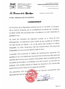 Le procureur de la République près le tribunal de 1ère instance de première classe de Cotonou, Jules Ahoga, A la faveur d’un communiqué de presse fait savoir que lors de la marche entreprise par la Confédération syndicale des travailleurs du Bénin (CSTB), 73 personnes ont été interpellées et gardées à vue. Une enquête judiciaire ouverte a permis de libérer 32 personnes ayant justifié leur qualité de travailleur, d’étudiants ou d’élèves. Quant au reste, l’enquête a révélé qu’il s’agit des personnes qui n’ont pas pu justifier leur qualité de travailleur et ont été recrutées dans des quartiers de Cotonou pour troubler l’ordre public.