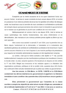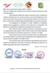 Le 1er mai 2024, soixante-quatorze (74) travailleurs militants de la CSTB ont été arrêtés par la police. Après leur présentation au Procureur, 32 personnes ont été libérées. La garde à vue de 42 travailleurs a été prolongée. Dans un communiqué de presse signé en date du 05 mai 2024, la CSA-Bénin, la CGTB, l’UNSTB et la COSI-Bénin condamnent cette arrestation et appellent à la libération immédiate et sans condition des quarante-deux (42) travailleurs encore gardés à vue. Les Confédérations réaffirment leur engagement à continuer de se battre pour la restauration des libertés et la satisfaction des légitimes revendications des travailleurs. Lire le communiqué…