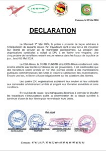 Soixante douze (72) travailleurs, tous militants de la Centrale des syndicats des travailleurs du Bénin (CSTB) ont été arrêtés , le mercredi 1er mai 2024 dans un mouvement de protestation pacifique. Cette arrestation pour la CSA-Bénin, la CGTB, l’UNSTB et la COSI-Bénin violent les libertés syndicales.  A travers cette  déclaration, elles expriment leur soutien et leur solidarité à ces travailleurs arrêtés par la police. Les quatre Confédérations Syndicales crient à une énième atteinte aux libertés syndicales par le Gouvernement. Elles appellent à la libération immédiate et sans conditions de ces militants. Pour elles, ces manœuvres destinées à intimider et étouffer les travailleurs n’émousseront guère la détermination de la classe ouvrière à continuer d’user de leur liberté pour revendiquer leurs droits.